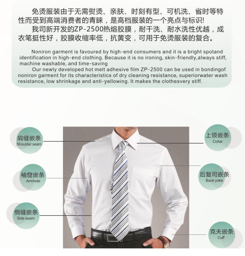O uso de forros de filme adesivo termofusível em golas e punhos de roupas tornou-se gradualmente uma escolha melhor para camisas sofisticadas que não podem ser passadas.